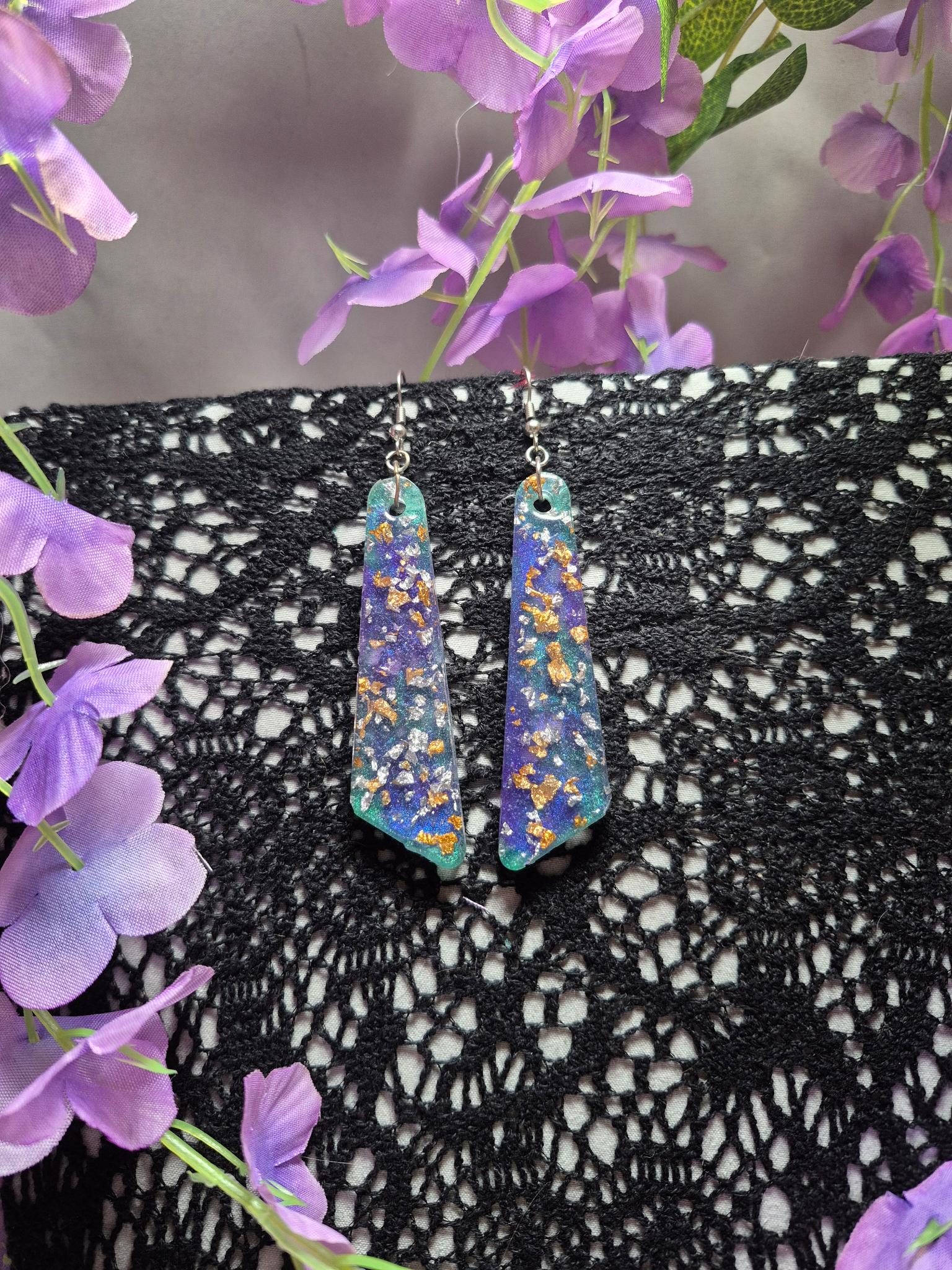 Handmade deep in the forests of Appalachia to be a shining light in the darkness. This pair of earrings are made from purple, blue and green resin with gold and silver flakes.