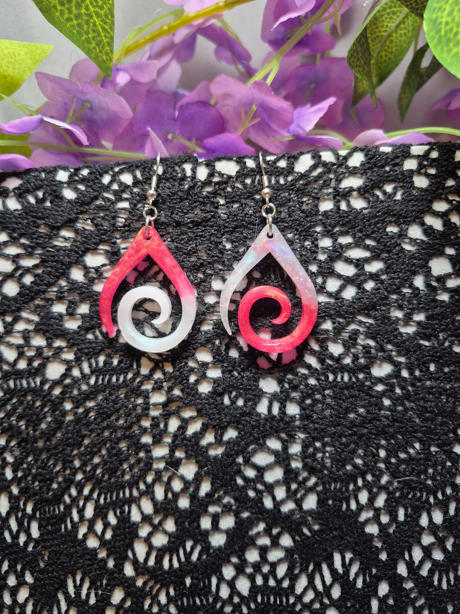 Handmade deep in the forests of Appalachia to be a shining light in the darkness. Opaque spiral teardrop resin (pink with a gold shift and white with green flakes) on silver-toned metal.